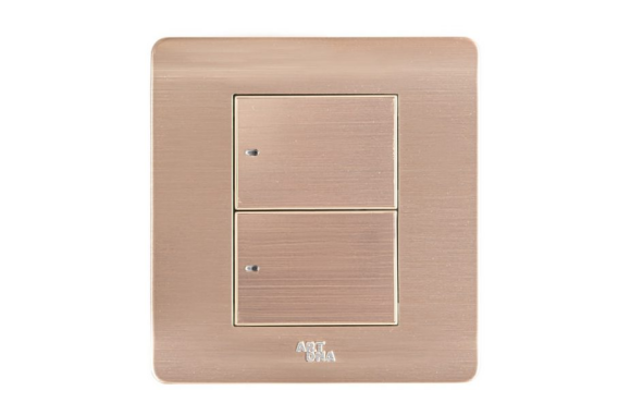 ModelA66-BK2A Miêu tảCông tắc led đôi, 1 chiều Đặc điểmNhôm vàng Màu sắcVàng Vật chấtAluminum Kích thước86 x 90mm Chất liệu mặtNhôm Anode vàng Khung đếĐế thép sơn tĩnh điện dầy 1.2mm
