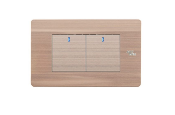 ModelA85-K2A Miêu tảCông tắc LED đôi, 1 chiều Đặc điểmNhôm Anode Vàng Màu sắcMặt hạt màu vàng Vật chấtNhôm Anode Kích thước120x73mm Chất liệu mặtNhôm Anode Khung đếĐế thép chữ nhật sơn tĩnh điện dày 1.2mm