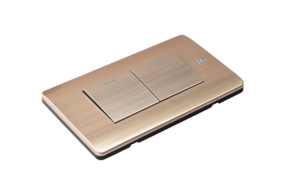 ModelA85-K02A Miêu tảCông tắc đôi, 1 chiều Đặc điểmNhôm Anode Vàng Màu sắcMặt hạt màu vàng Vật chấtNhôm Anode Kích thước120x73mm Chất liệu mặtNhôm Anode Khung đếĐế thép chữ nhật sơn tĩnh điện dày 1.2mm