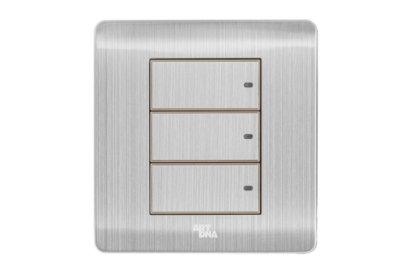 ModelA66S-BK3A Miêu tảCông tắc LED ba, 1 chiều Đặc điểmInox SUS 304 dày 1.2mm Màu sắcInox Vật chấtInox SUS 304 Kích thước86x90mm Chất liệu mặtInox SUS 304 Khung đếĐế thép sơn tĩnh điện 1.2mm