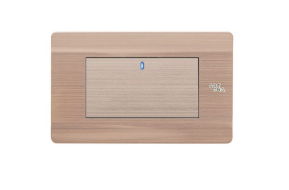ModelA85-BK1A Miêu tảCông tắc LED đơn, 1 chiều Đặc điểmNhôm Anode Vàng Màu sắcMặt hạt màu vàng Vật chấtNhôm Anode Kích thước120x73mm Chất liệu mặtNhôm Anode Khung đếĐế thép chữ nhật sơn tĩnh điện dày 1.2mm