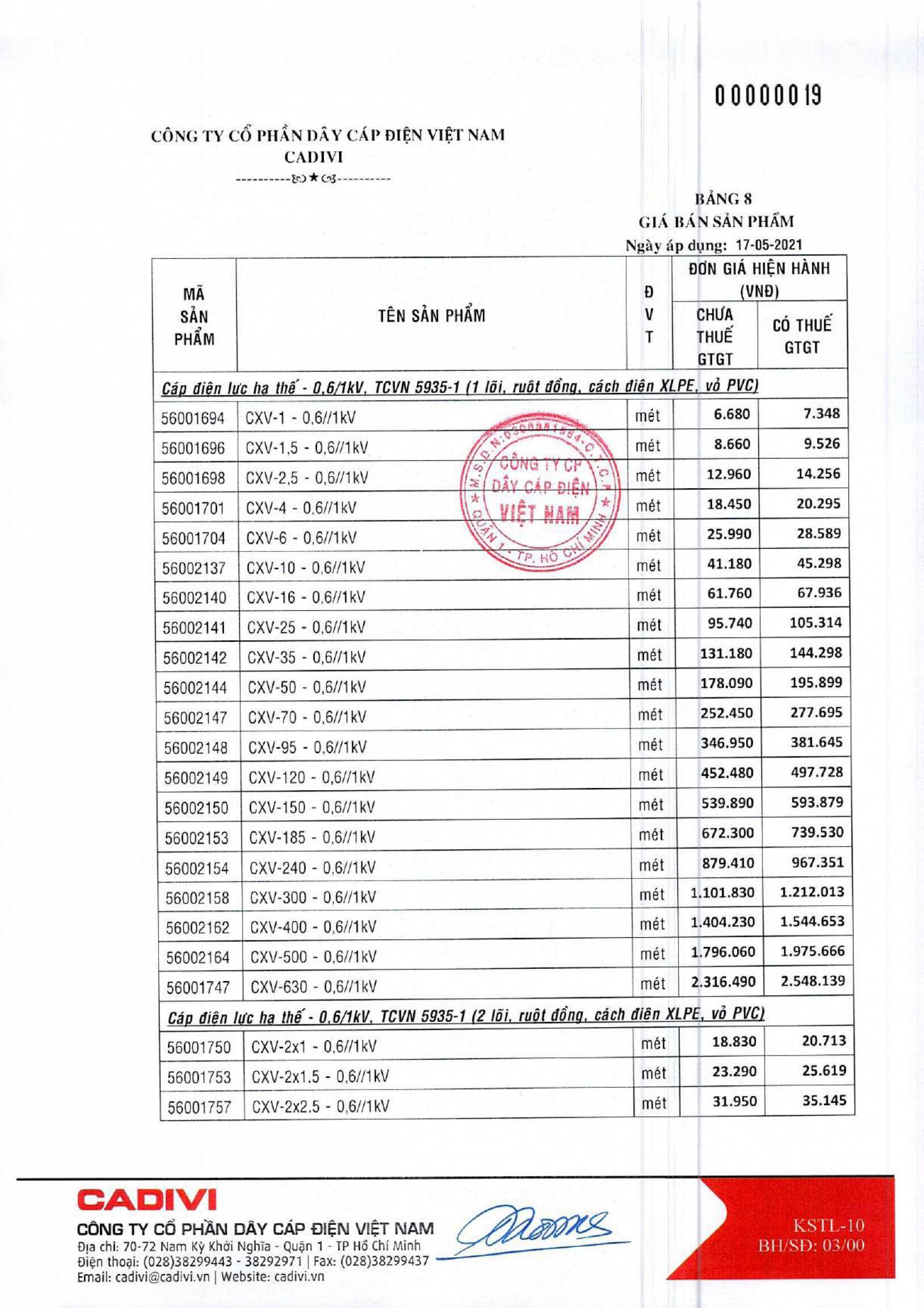 Cáp CXV dùng cho hệ thống truyền tải và phân phối điện, cấp điện áp 0,6/1 kV, lắp đặt cố định.