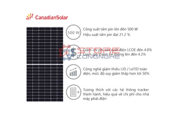 Tấm pin mono 485W HiKu5 thương hiệu Canadian Solar là dòng pin đơn tinh thể được sản xuất theo công nghệ làm mát Ku Modules, dựa trên nền tảng công nghệ Low Internal Current (LIC) Modules. Công suất tấm pin lên đến 485W, giảm chi phí sản xuất điện LCOE đến 4.0%, giảm giá thành hệ thống lên đến 4.2%. Được trang bị công nghệ tối tân nhất như: Half-cut cells, PERC, Multi Busbars…. giúp hệ thống điện mặt trời đạt hiệu suất và sản lượng cao, giảm mức độ ảnh hưởng của đổ bóng.